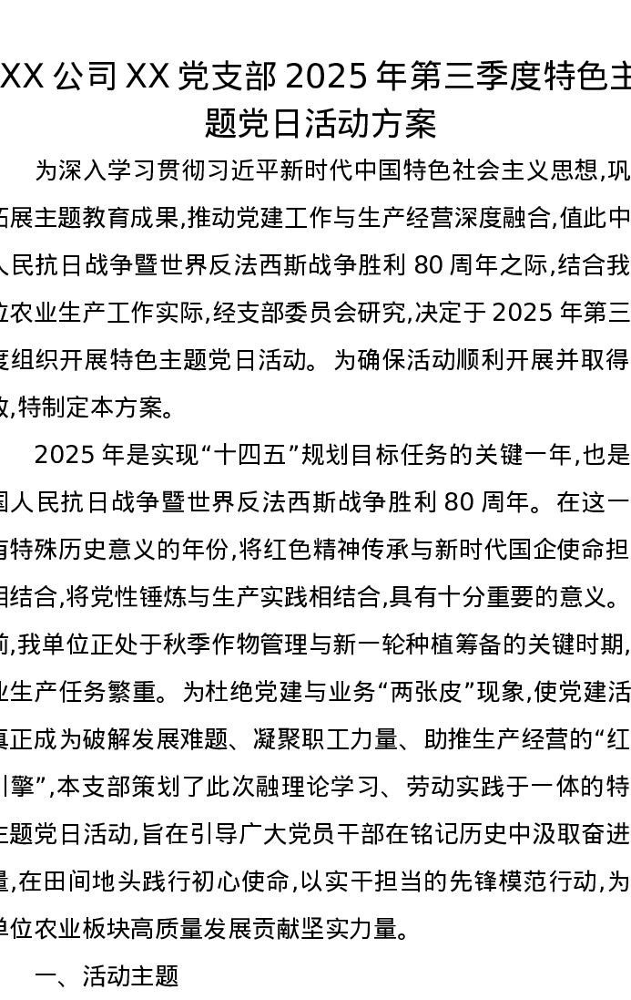 XX公司XX党支部2025年第三季度特色主题党日活动方案