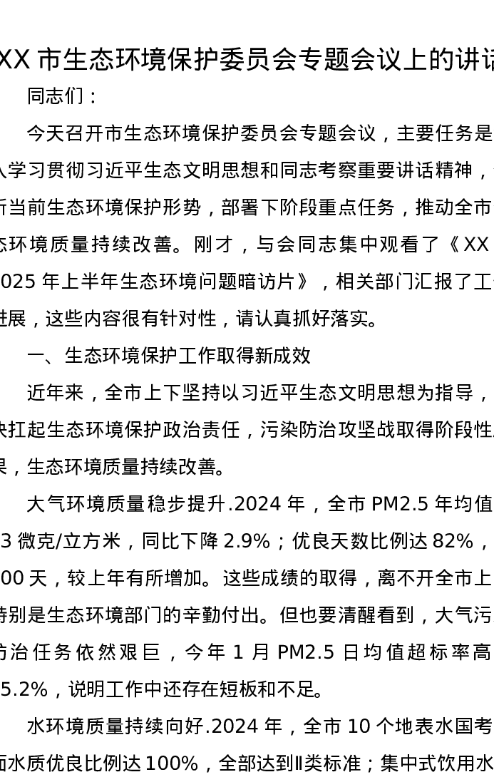 XX市生态环境保护委员会专题会议上的讲话