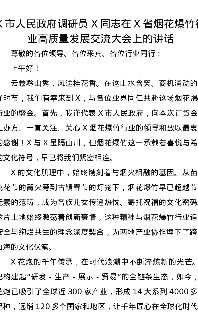 X市人民政府调研员X同志在X省烟花爆竹行业高质量发展交流大会上的讲话