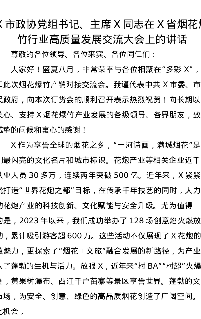 X市政协党组书记、主席X同志在X省烟花爆竹行业高质量发展交流大会上的讲话
