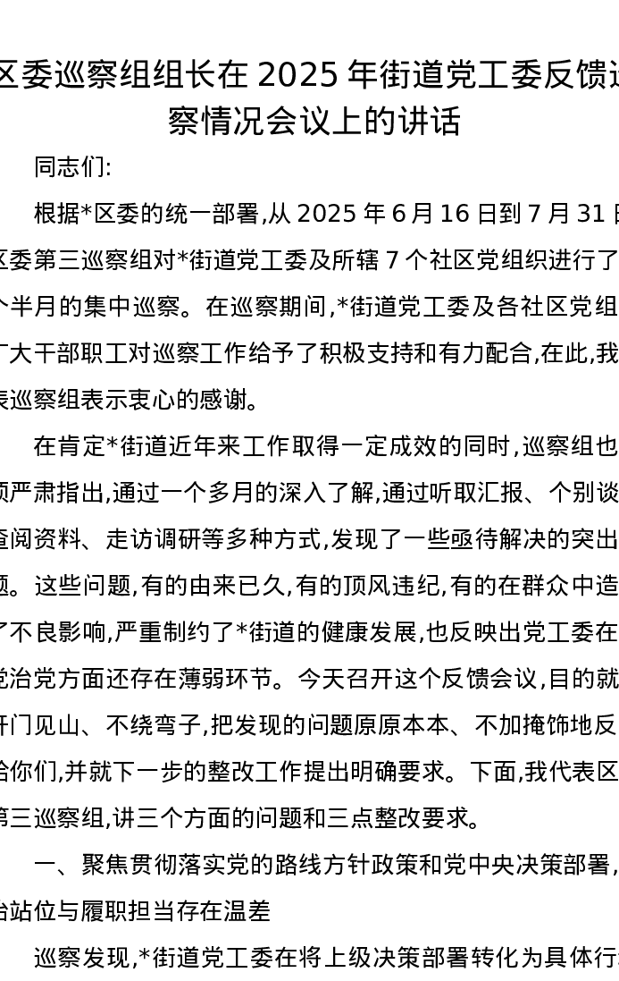 区委巡察组组长在2025年街道党工委反馈巡察情况会议上的讲话
