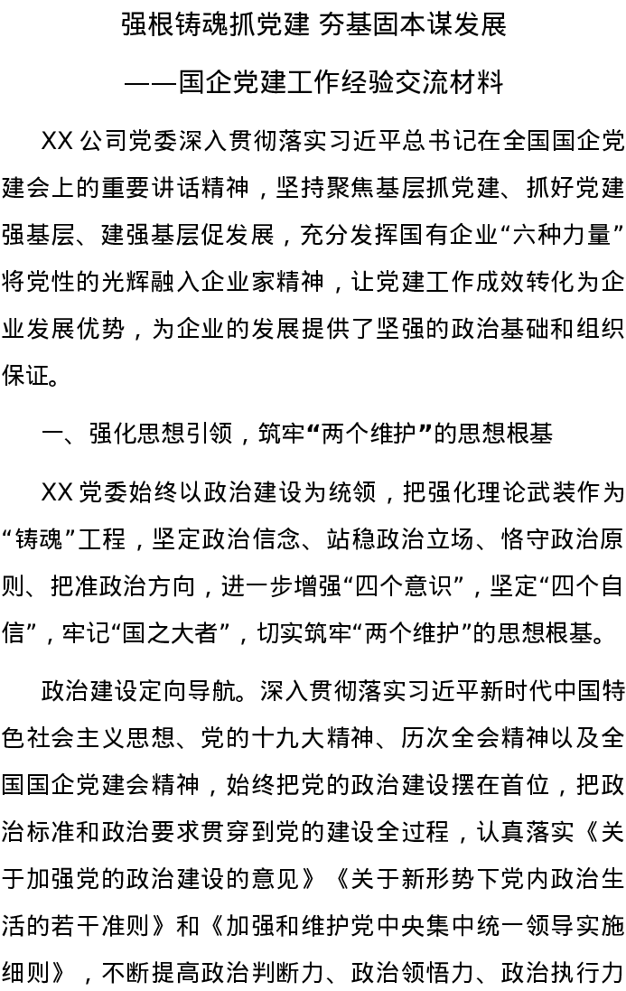 20220101强根铸魂抓党建 夯基固本谋发展——国企党建工作经验交流材料