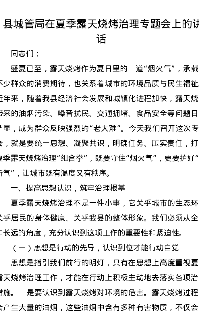 县城管局在夏季露天烧烤治理专题会上的讲话