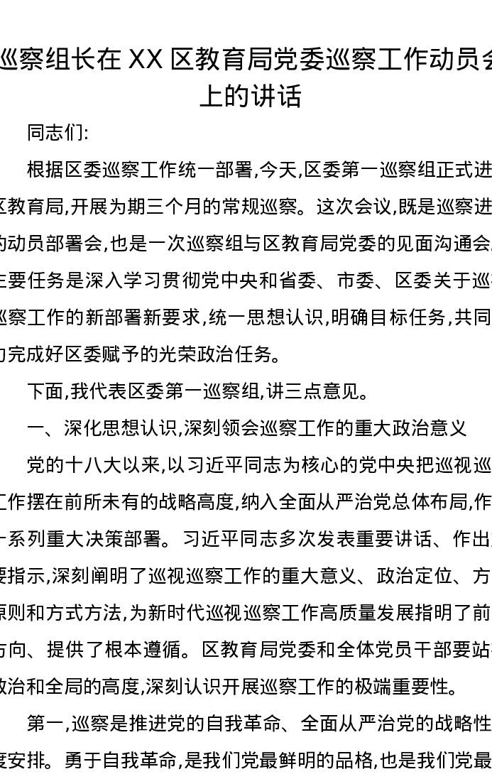 巡察组长在XX区教育局党委巡察工作动员会上的讲话