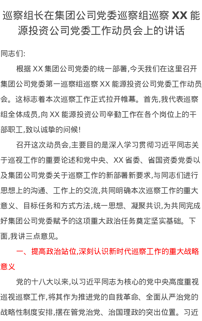 巡察组长在集团公司党委巡察组巡察XX能源投资公司党委工作动员会上的讲话