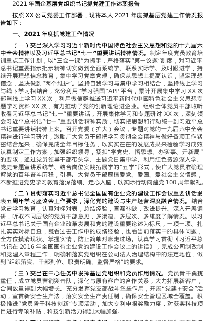 20220105-2021年国企基层党组织书记抓党建工作述职报告
