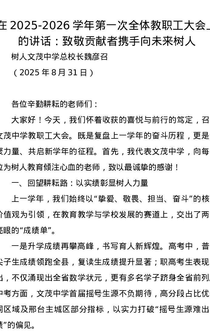 在2025-2026学年第一次全体教职工大会上的讲话:致敬贡献者携手向未来树人