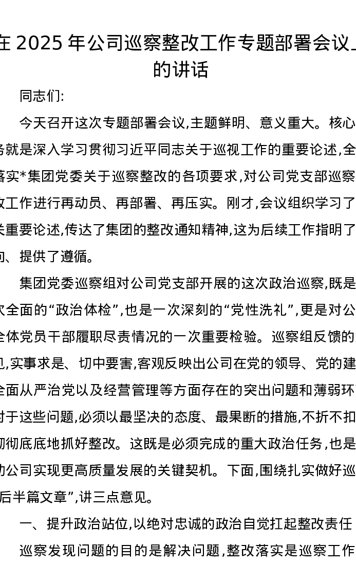 在2025年公司巡察整改工作专题部署会议上的讲话