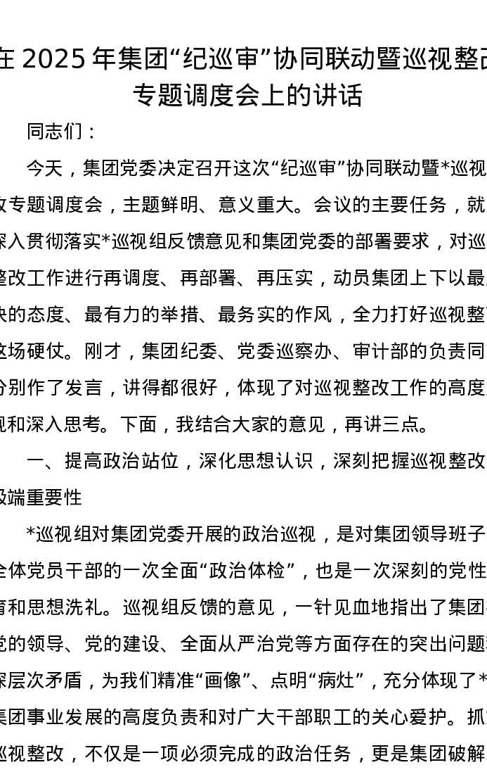 在2025年集团“纪巡审”协同联动暨巡视整改专题调度会上的讲话