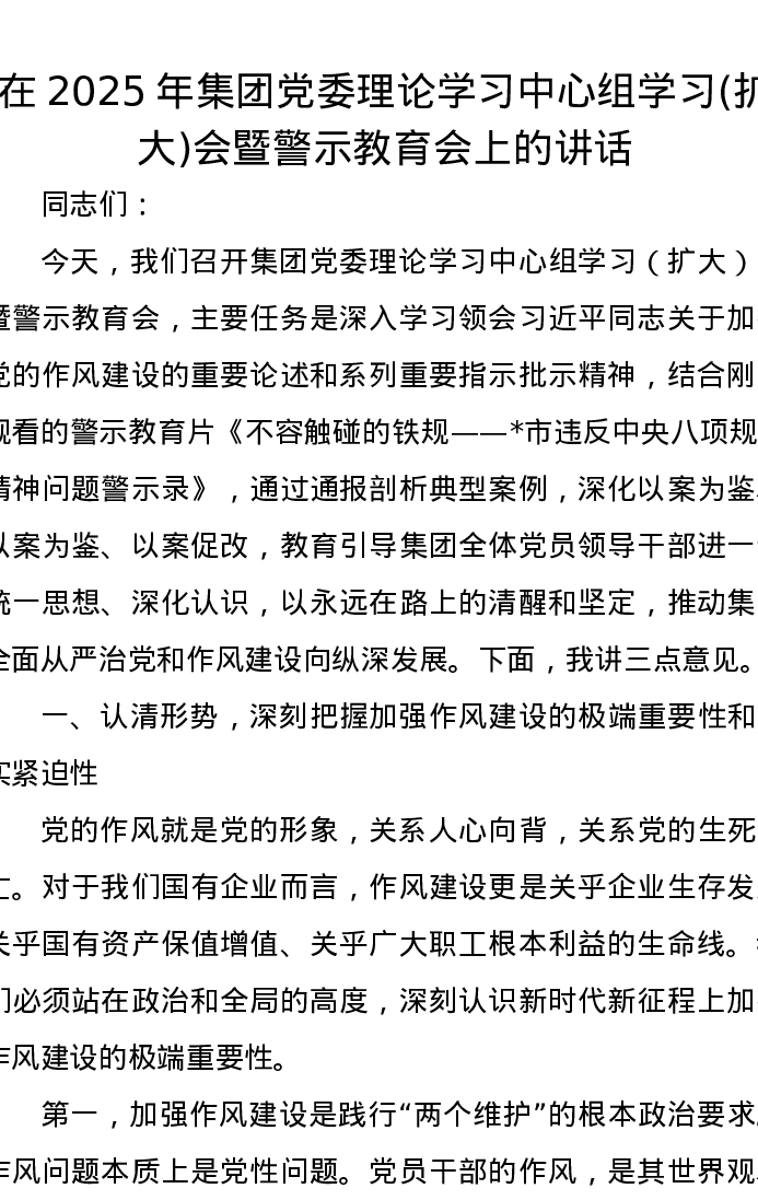 在2025年集团党委理论学习中心组学习(扩大)会暨警示教育会上的讲话