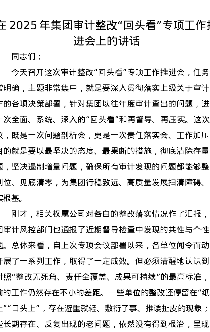 在2025年集团审计整改“回头看”专项工作推进会上的讲话