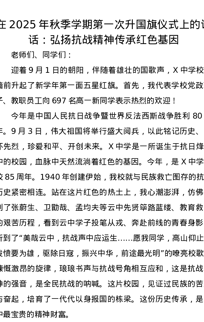 在2025年秋季学期第一次升国旗仪式上的讲话:弘扬抗战精神传承红色基因