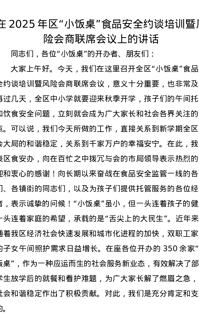 在2025年区“小饭桌”食品安全约谈培训暨风险会商联席会议上的讲话