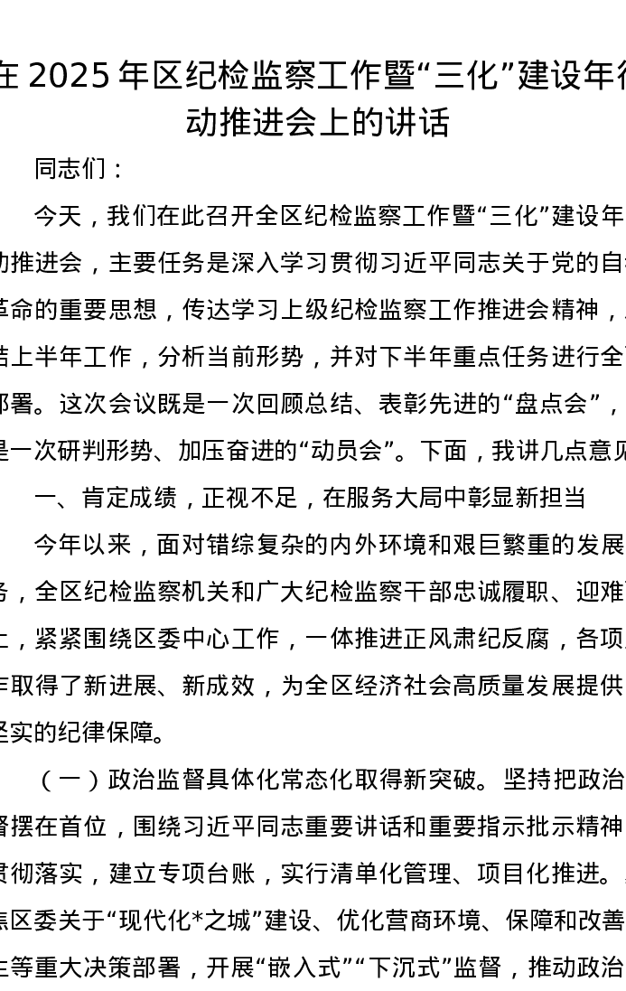 在2025年区纪检监察工作暨“三化”建设年行动推进会上的讲话