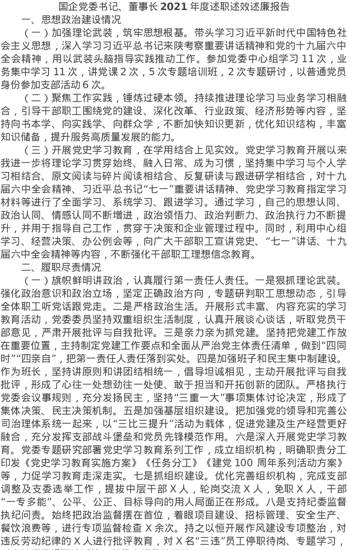 20220105国企党委书记、董事长2021年度述职述效述廉报告