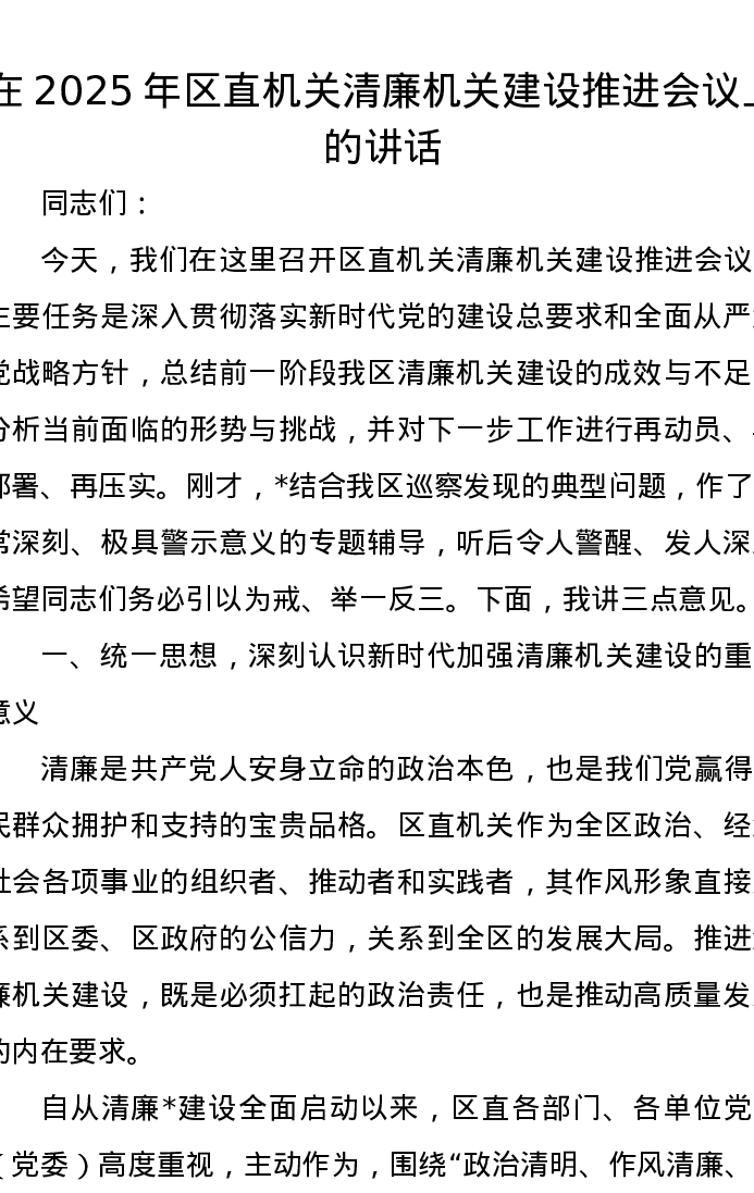 在2025年区直机关清廉机关建设推进会议上的讲话