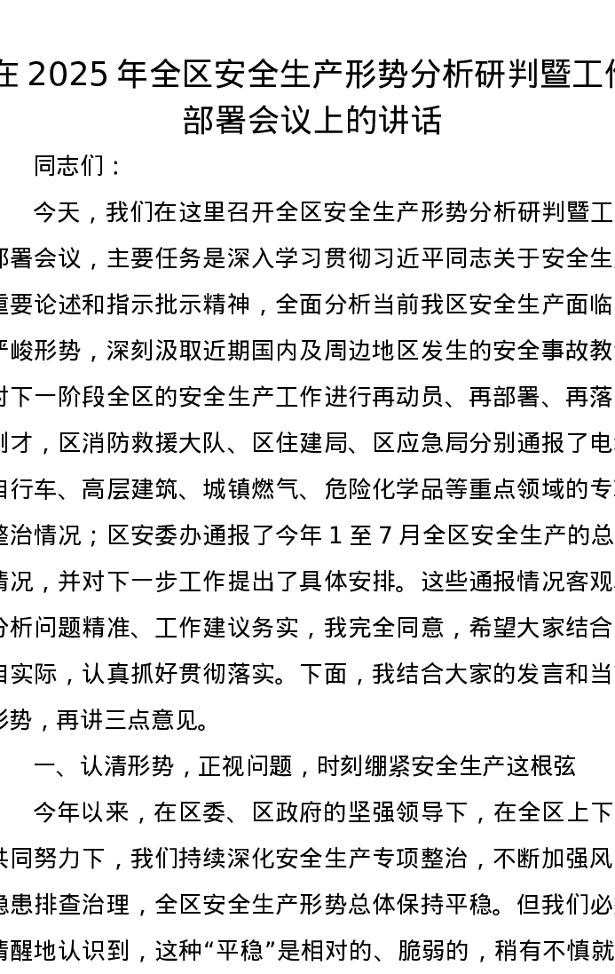 在2025年全区安全生产形势分析研判暨工作部署会议上的讲话
