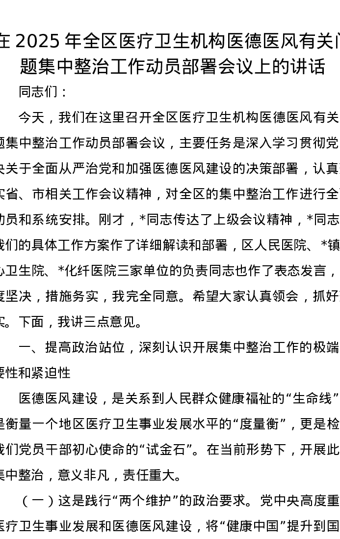 在2025年全区医疗卫生机构医德医风有关问题集中整治工作动员部署会议上的讲话