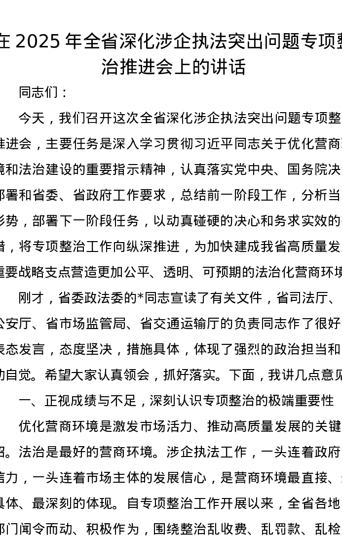 在2025年全省深化涉企执法突出问题专项整治推进会上的讲话