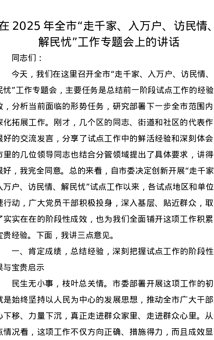 在2025年全市“走千家、入万户、访民情、解民忧”工作专题会上的讲话