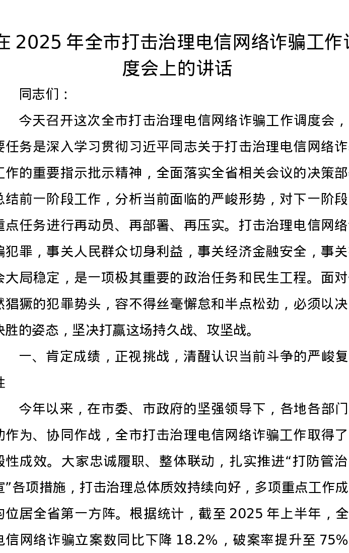 在2025年全市打击治理电信网络诈骗工作调度会上的讲话