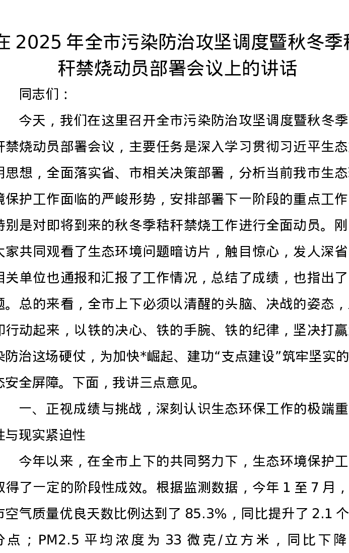 在2025年全市污染防治攻坚调度暨秋冬季秸秆禁烧动员部署会议上的讲话