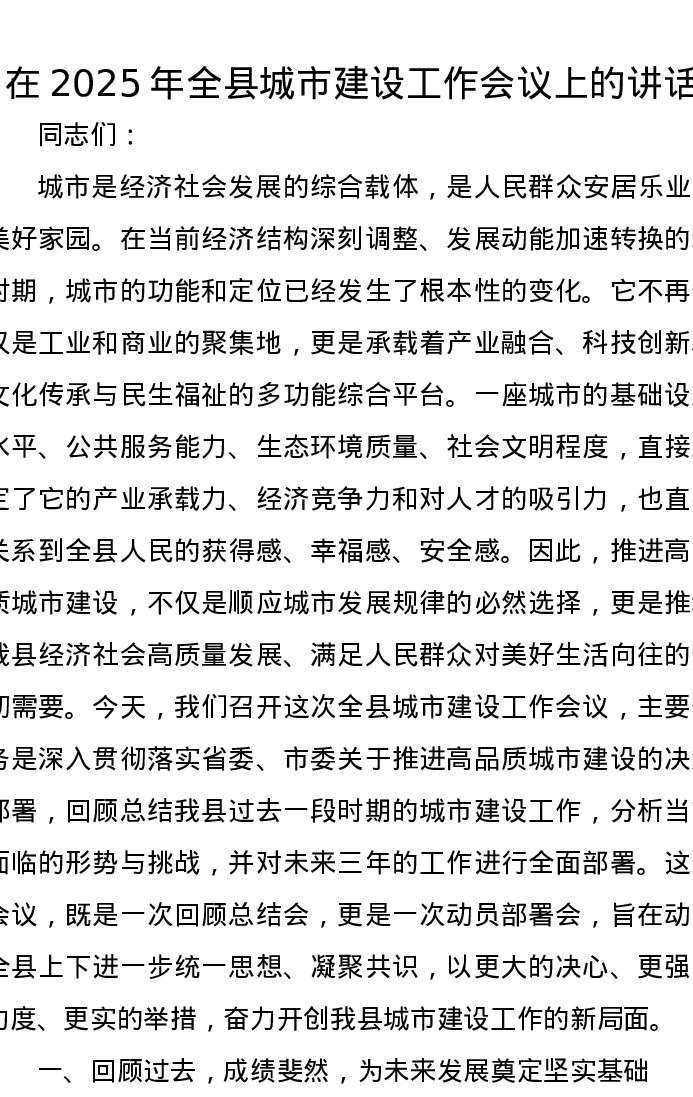 在2025年全县城市建设工作会议上的讲话
