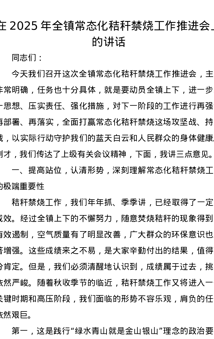 在2025年全镇常态化秸秆禁烧工作推进会上的讲话
