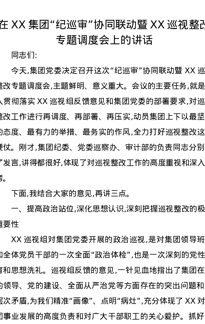 在XX集团“纪巡审”协同联动暨XX巡视整改专题调度会上的讲话