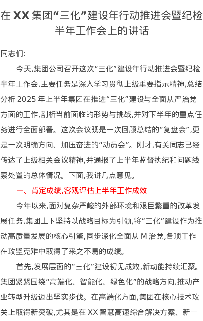 在XX集团“三化”建设年行动推进会暨纪检半年工作会上的讲话