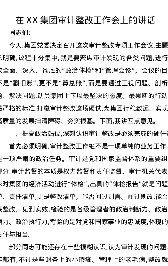 在XX集团审计整改工作会上的讲话