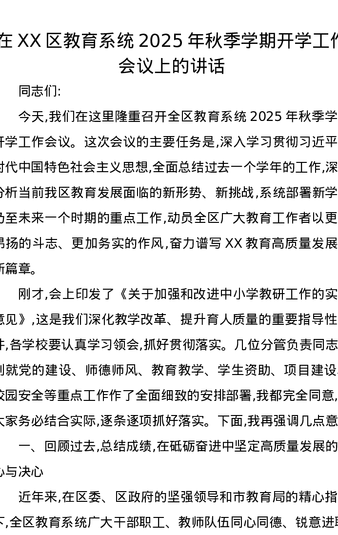 在XX区教育系统2025年秋季学期开学工作会议上的讲话