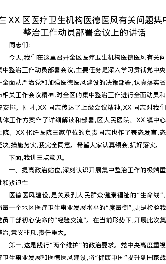 在XX区医疗卫生机构医德医风有关问题集中整治工作动员部署会议上的讲话