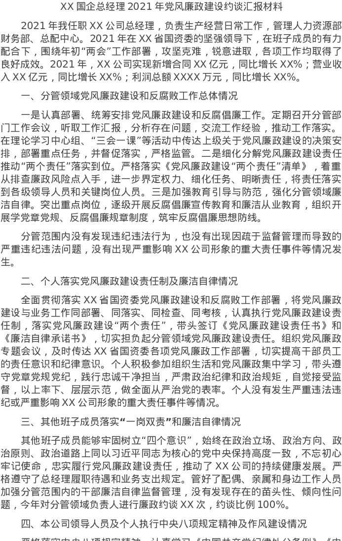 20220109XX国企总经理2021年党风廉政建设约谈汇报材料