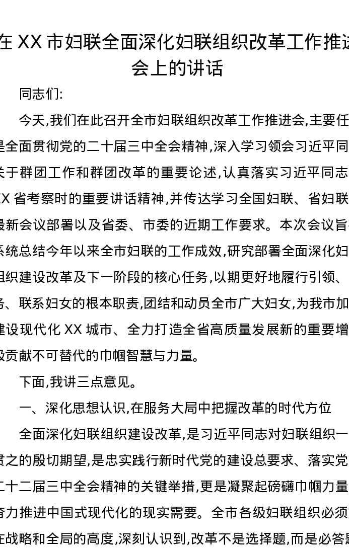 在XX市妇联全面深化妇联组织改革工作推进会上的讲话