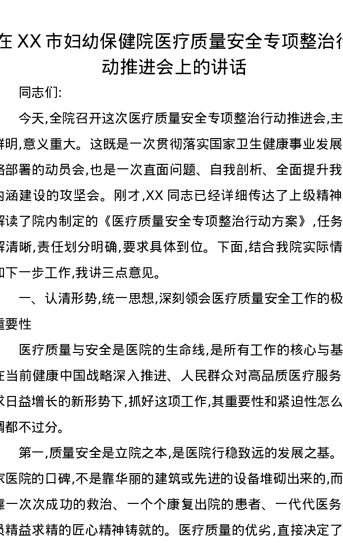 在XX市妇幼保健院医疗质量安全专项整治行动推进会上的讲话