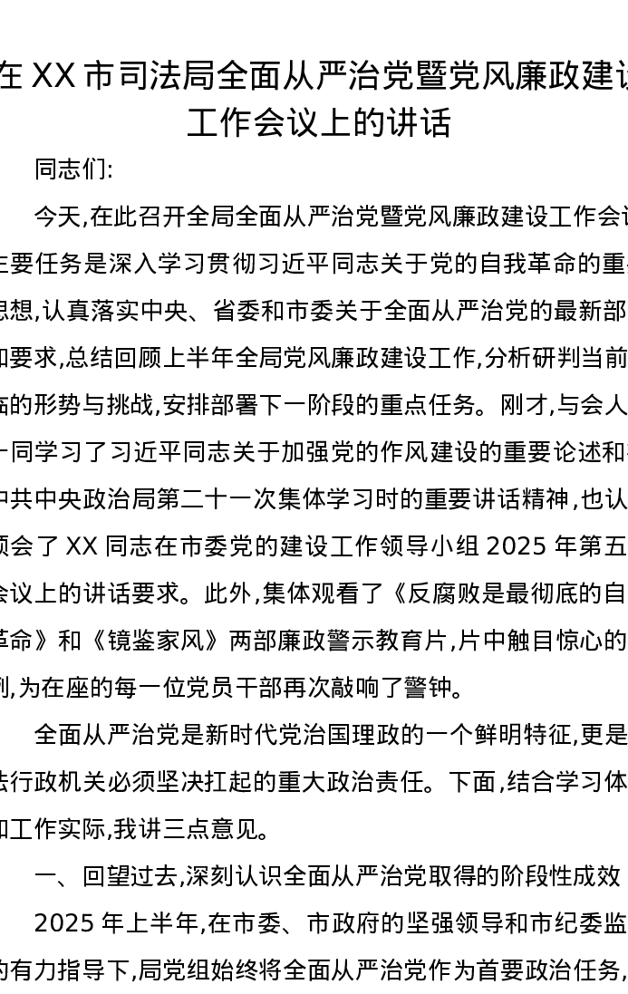 在XX市司法局全面从严治党暨党风廉政建设工作会议上的讲话