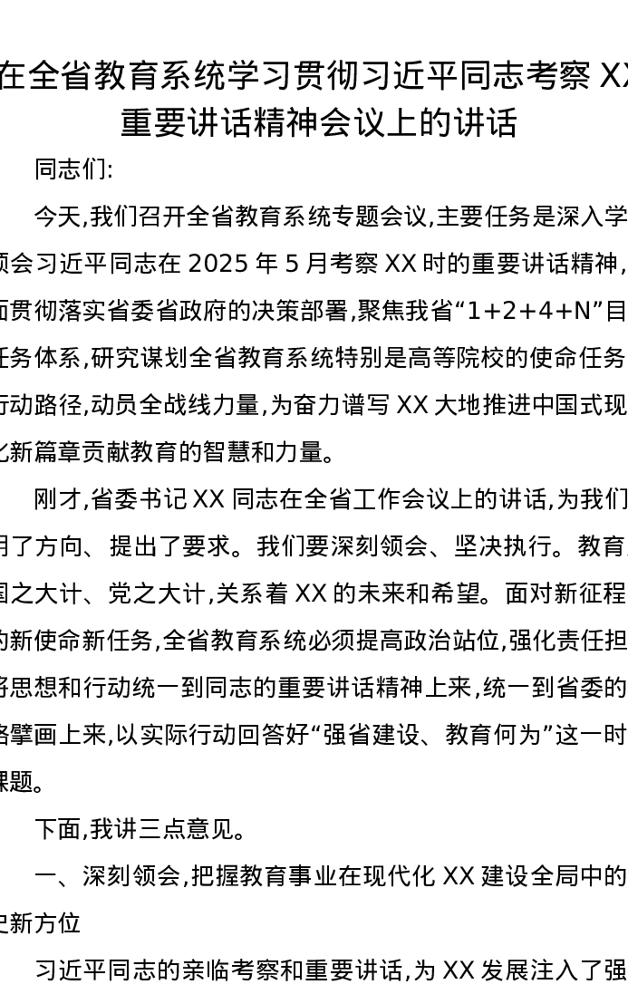 在全省教育系统学习贯彻习近平总书记考察XX重要讲话精神会议上的讲话