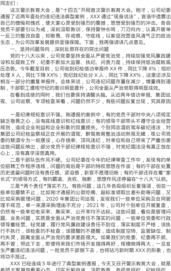 20220114国企公司警示教育大会总结讲话