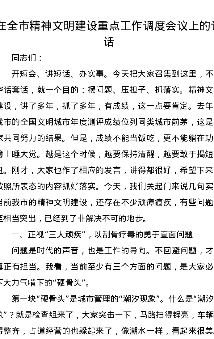 在全市精神文明建设重点工作调度会议上的讲话