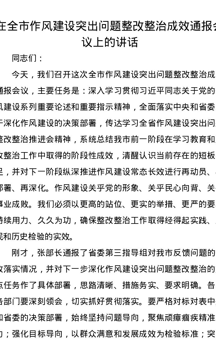 在全市作风建设突出问题整改整治成效通报会议上的讲话