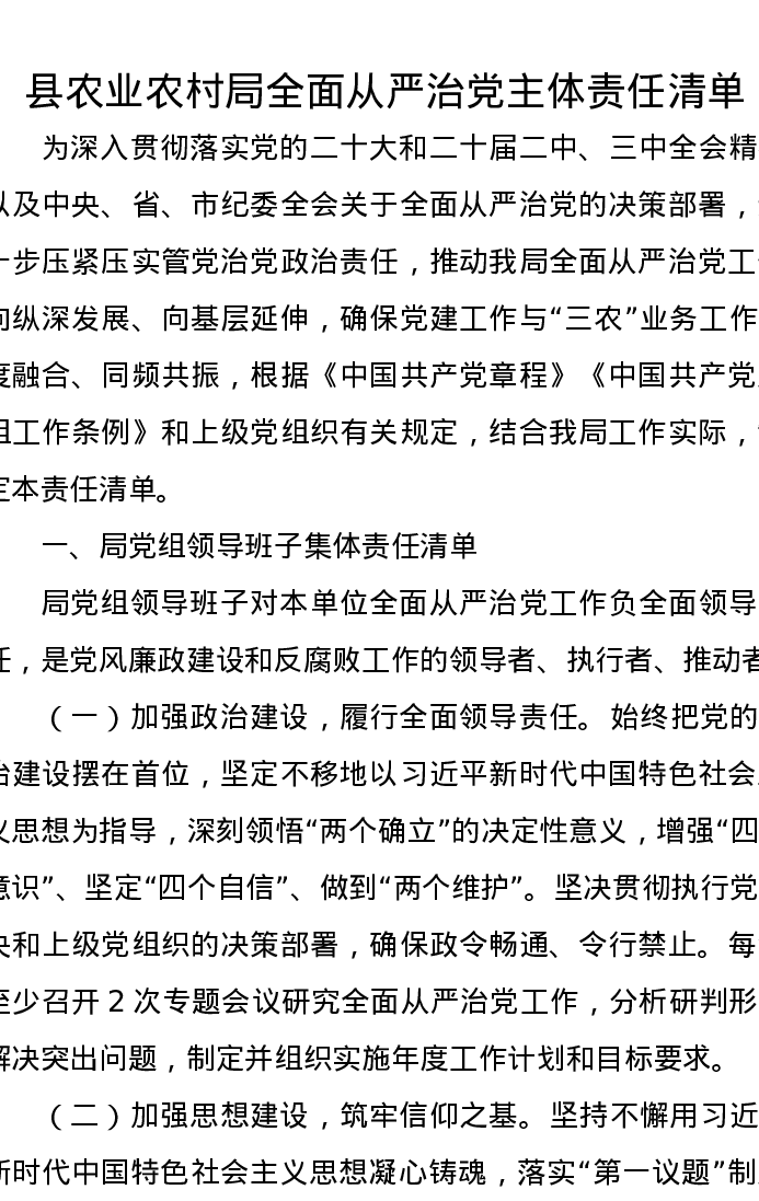 县农业农村局全面从严治党主体责任清单