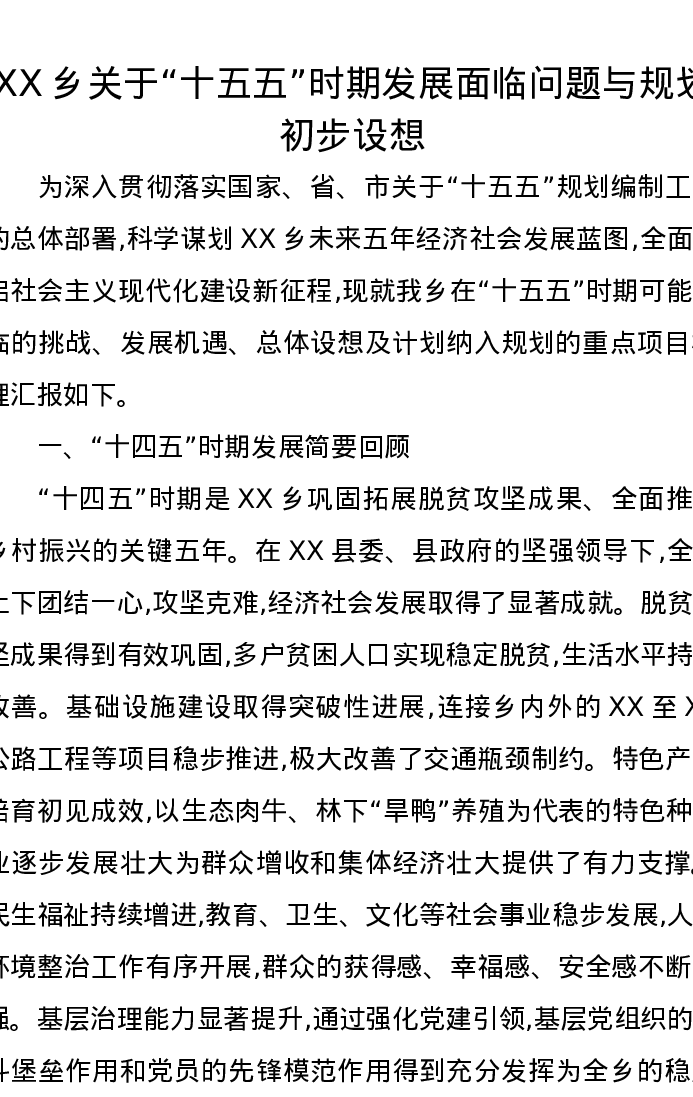 XX乡关于“十五五”时期发展面临问题与规划初步设想