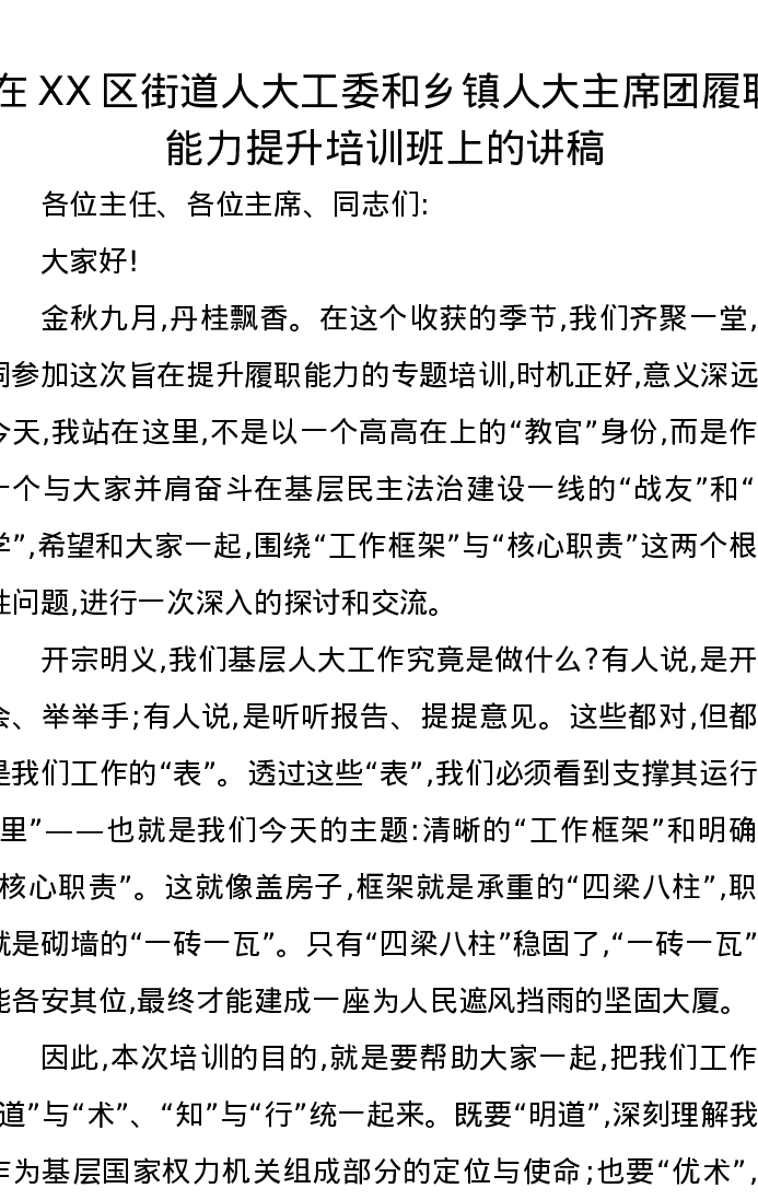 在XX区街道人大工委和乡镇人大主席团履职能力提升培训班上的讲稿