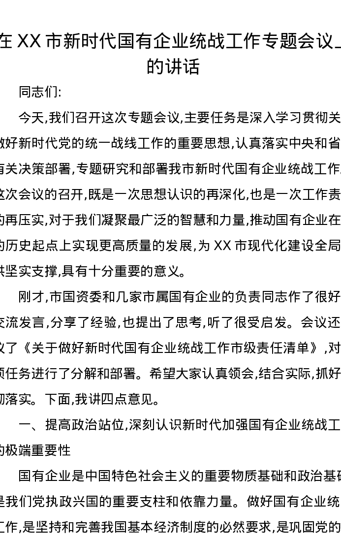 在XX市新时代国有企业统战工作专题会议上的讲话