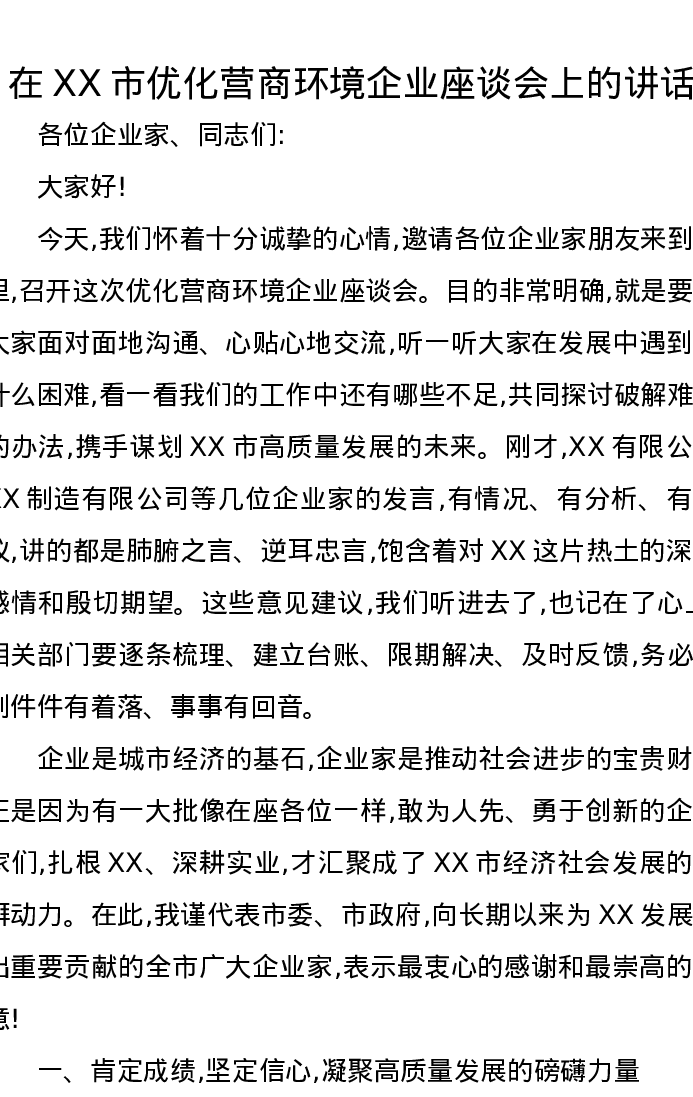 在XX市优化营商环境企业座谈会上的讲话