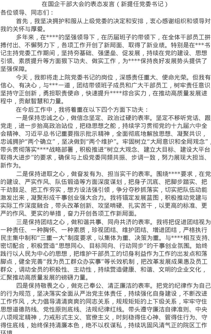 20220206在国企干部大会的表态发言(新提任党委书记)
