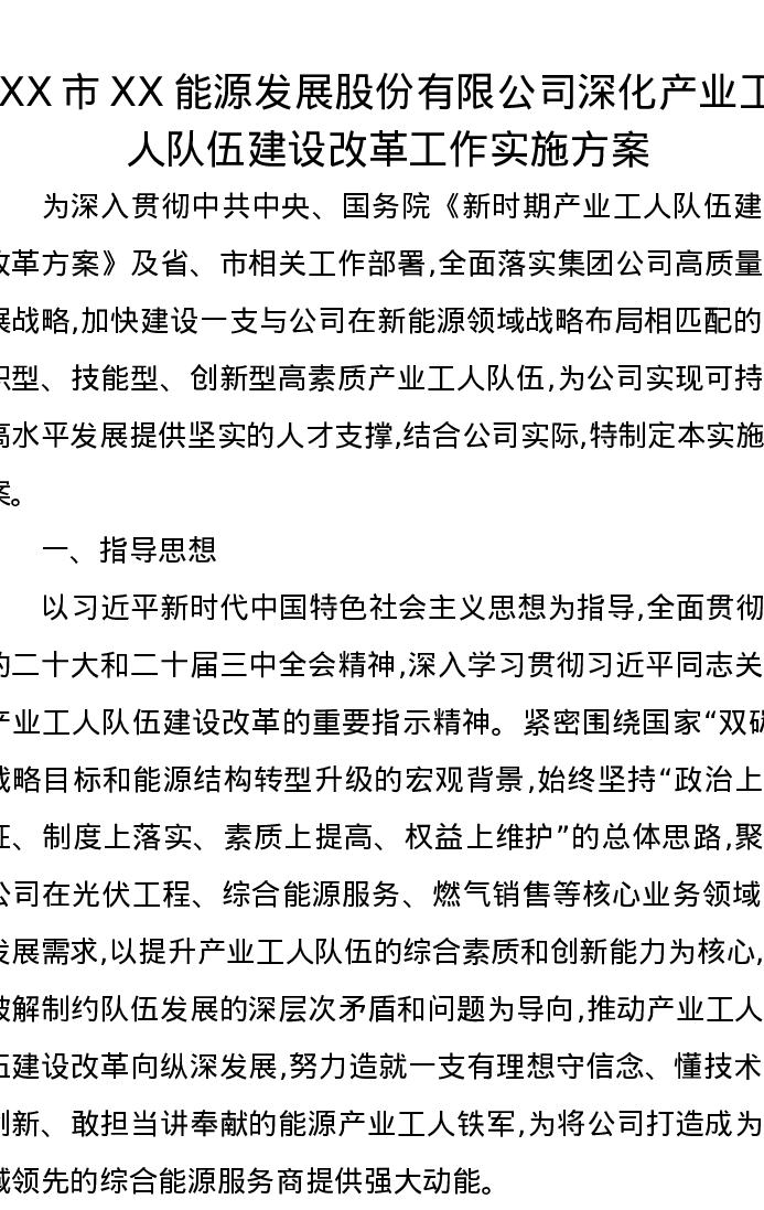 XX市XX能源发展股份有限公司深化产业工人队伍建设改革工作实施方案