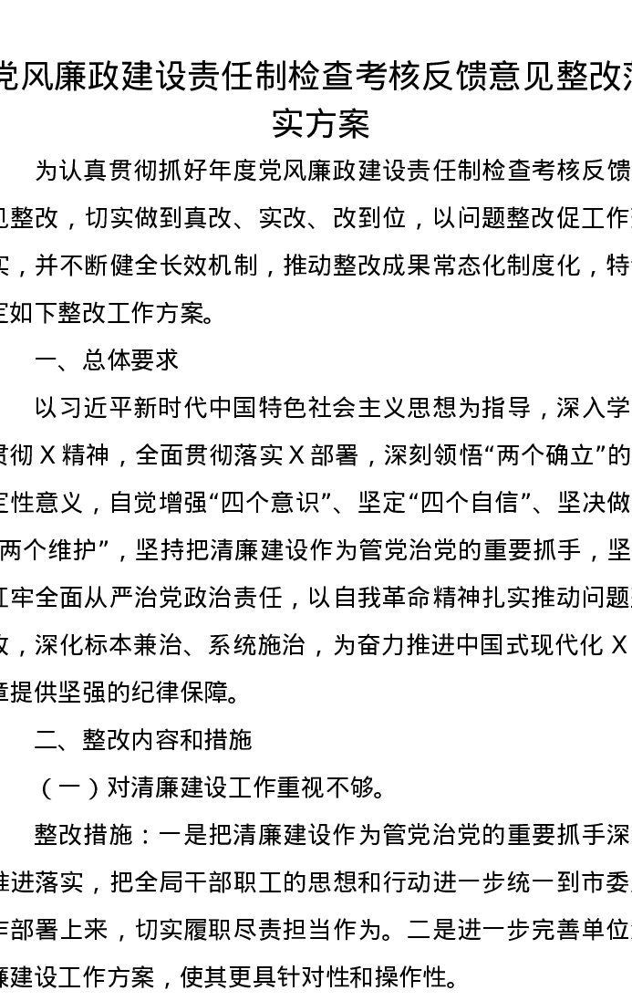 党风廉政建设责任制检查考核反馈意见整改落实方案
