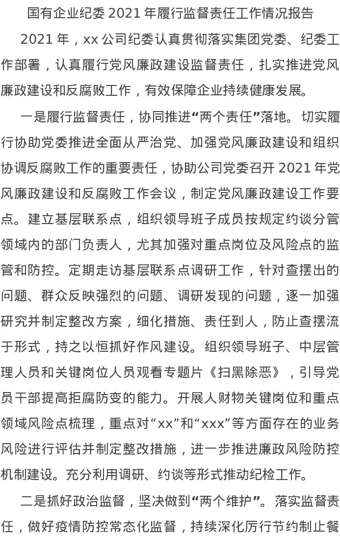 20220208国有企业纪委2021年履行监督责任工作情况报告